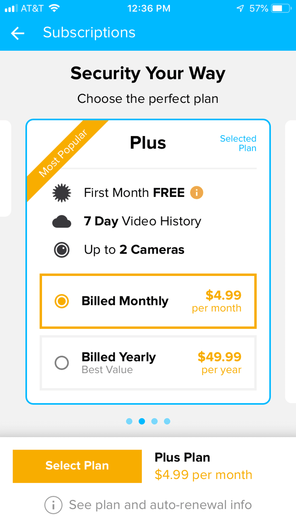 Momentum offers subscription plans for the Robbi smart camera. The Lite Plan is free, and offers 24-hour video and still image storage. You can also opt into the Plus plan, which offers the first month free, plus a 7-day video history for up to two cameras, which is $4.99 a month or $49.99 if billed annually. There's also the Premium plan, with the first month free, and a 30-day video history for up to five cameras for $99.99 per month or $99.099 billed yearly. Finally, the Pro Plan also offers the first month for free, along with a 60-day video history for up to 10 cameras. For this plan, you'll pay $19.99 per month or $199.99 a year.
