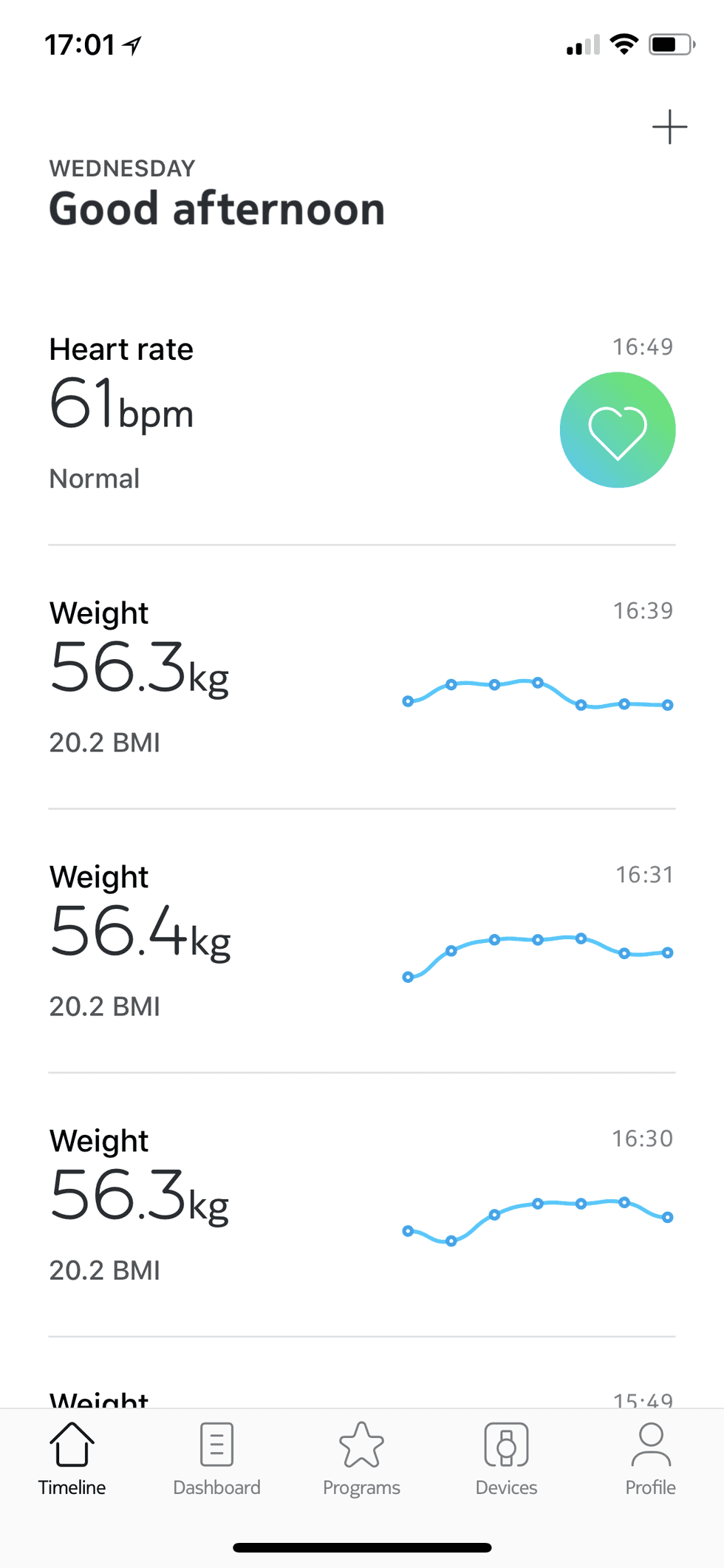 The app lists all of your measurements in chronological order and also presents a dashboard of your most recent reading for each parameter. There are a range of 'wellness programs' onto which you can enroll. One aims to give advice on improving sleep over an eight-week period, one is designed to help give advice on improving the health of your heart (for which a Nokia heart rate device like the BMP+ is required), and another is designed to track pregnancy.