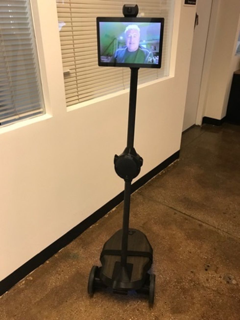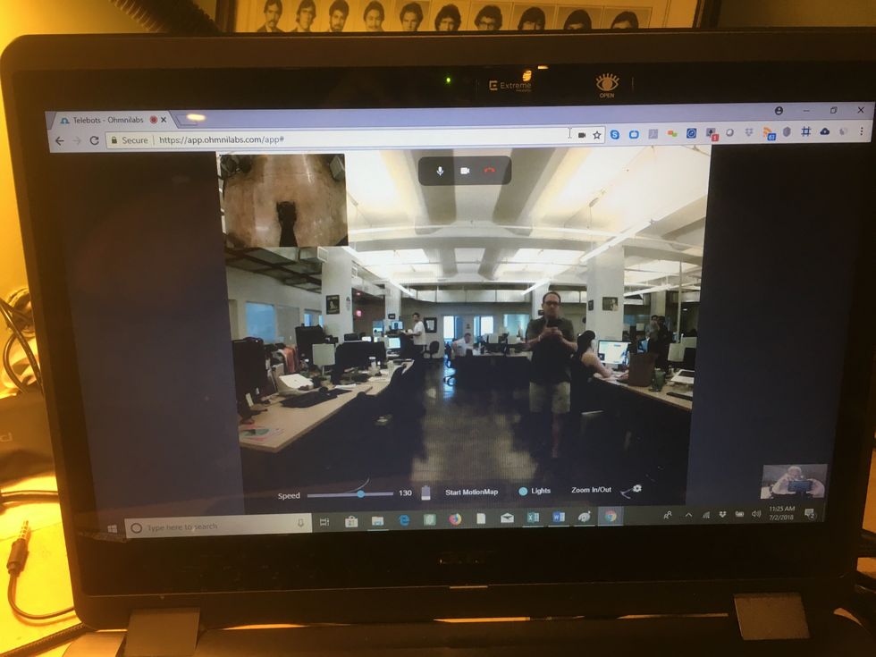 Navigating the Ohmni robot is incredibly easy — you just use your directional keys on the computer to move forward, backward and even turn. You can maneuver rather easily around the house or office, and if you're good at video games, navigating will come naturally.The robot has two cameras: one looks outward ,and the other looks down. The front camera is clear, even if it's not a wide field of view. Point the camera down, and you can see the base of the robot, which can help you avoid hitting any objects as you move.