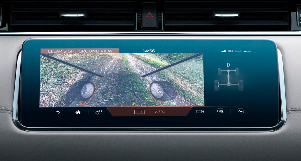 Using cameras in the wing mirrors and front grille, the car serves up an augmented view of the ground between the front wheels, displayed on one of the Evoque's two 10-inch dashboard touchscreens.