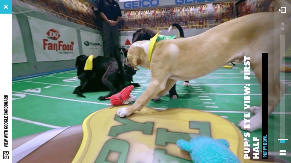 Do you like sending your friends cute animal pictures? Up your game with a 360 video of puppies from "Pup's Eye View," truly the best use of this technology the world has ever seen. The Puppy Bowl videos are short and sweet, about two minutes long. "Pup's Eye View" give you a seat in the house that no audience seat or normal camera could ever properly capture. It's like all the joy of a dog park with none of the smell.