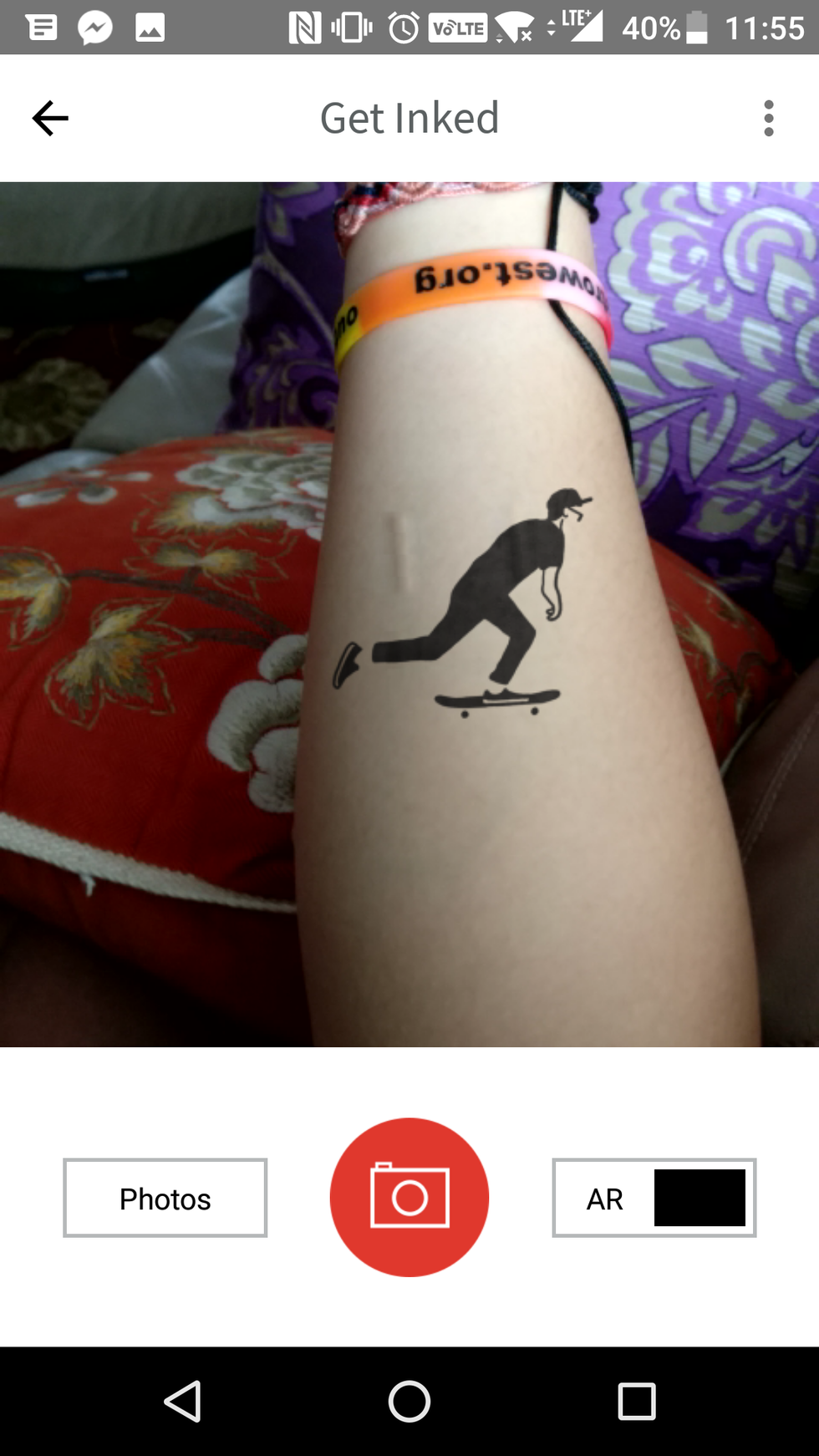 I then tried on a bird, a skater boy and a colorful skull. When I moved my arm around and shifted angles, the tattoo did a good job of staying put. For some designs, the app will ask you to watch a short video (read: an advertisement) which is usually not even a video. Just click off the ad and don't give the creators too much grief about their hustle.