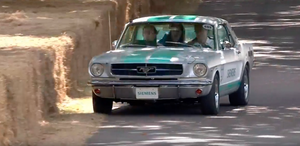 A second autonomous car took on the Goodwood hill, in the form of a 1965 Ford Mustang developed by Siemens, below. The car, with Goodwood estate owner the Duke of Richmond on board, struggled to navigate its way along the course. Despite following a pre-programed route, the car repeatedly veered towards the hay bales - even on the straights - and required the safety driver to frequently grab the wheel.