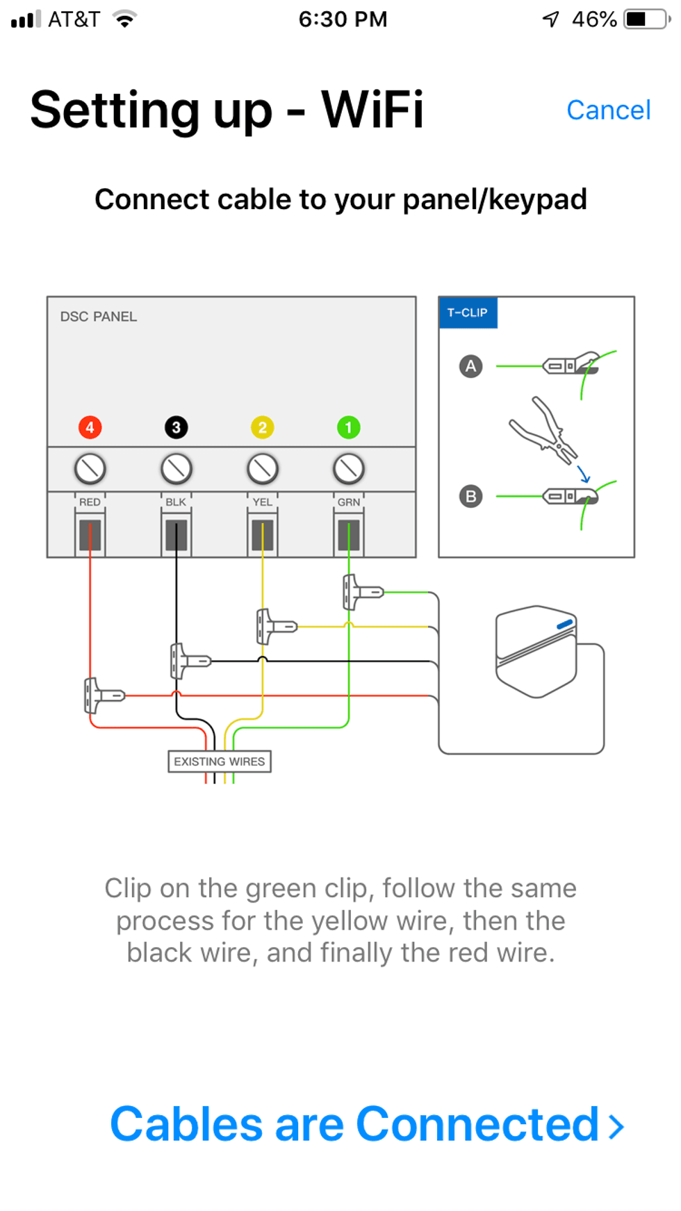 Once the hub is installed and on Wi-Fi, you will need to connect the supplied cables to your existing home security system's panel. In the app, Safe by Hub6 diagrams which wires you'll need to connect, and also provides two types of cables (wiring) for you to use: T-Clips and stripped cables. The company recommends using the T-Clips, which we did, finding them easy to use. But avoid breaking the clips, as that's easy to do if you are not careful connecting them to the panel's wiring.