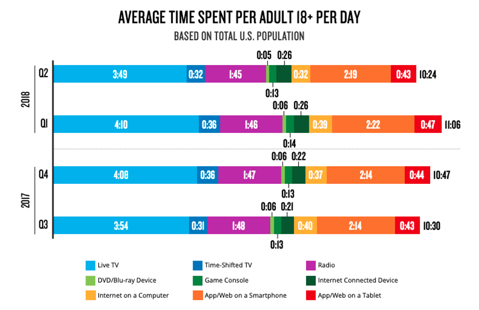 A 2018 consumer trend report by Nielsen claimed American adults, on average, watch just five minutes of content on DVD or Blu-ray each day, compared to nearly four hours of live TV. The report also claimed a third of US adults do not even own a DVD or Blu-ray player.