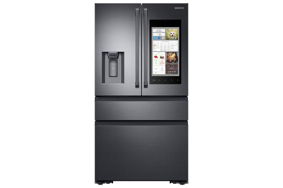 • In the door of LG's second-generation Smart InstaView refrigerator is a 29-inch webOS-powered vertical touchscreen that, when knocked on, will turn transparent so you can see inside. Equipped with Wi-Fi, the fridge also incorporates Amazon Alexa so can talk to it to order food, will play music through a 10-watt Bluetooth speaker and can stream video content. A "panoramic view" camera lets you see if you need milk or eggs, and the fridge analyze your usage and eating patterns and predict your family's activities based on their past behavior, while scanning food items result in expiration date alerts;