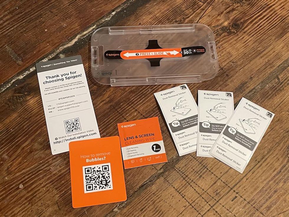 First step — always — is to clean the iPhone screen and Spigen sends not only alcohol wipes but also a cloth to ensure you get that glass perfect before you cover it. There are also stickers that remove dust particles if you need as well.