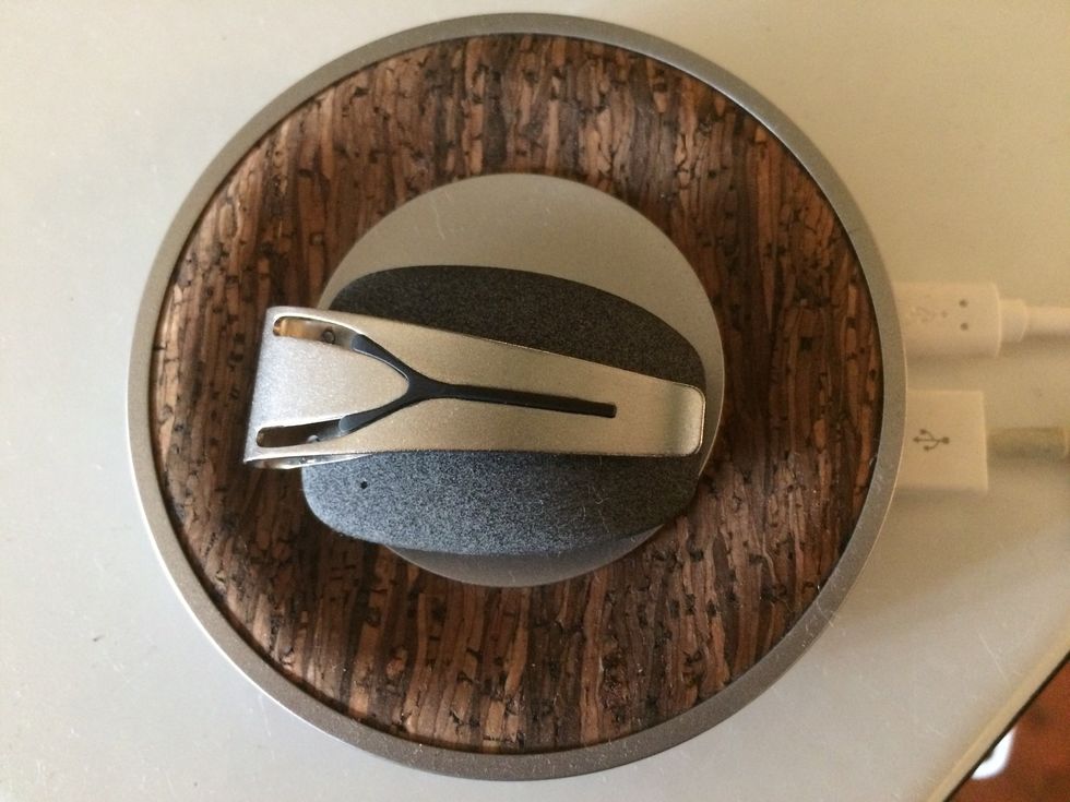 You charge Spire on a rounded disc, metal in the center, wood-colored cork around the edges, which is included in the $99.95 package. Spire charges by just laying in the disc, which itself is plugged into the wall. An added bonus is a USB plug built into the charger so you can also use the disc to power your smartphone. (Yes, I liked that.) And yes, Spire works with both iOS and Android devices.