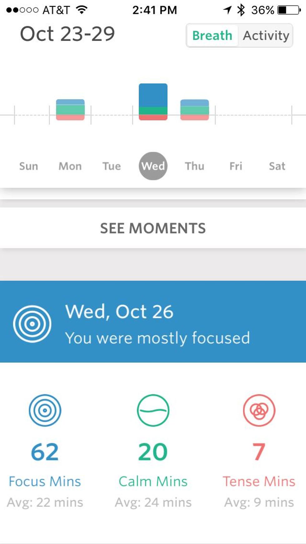 But Spire is of course much more than that. The device keeps track of what it calls moments—stretches of calm, tense and focused that you have during your day. Calm and tense are fairly simple to understand. With Spire, calm occurs when you're breathing more slowly than your average, and evenly. Tension? That's when my breathe was faster than average and often erratic, and changing often. Focus also registered when my breathe was faster than average, but with a regular, even pattern.