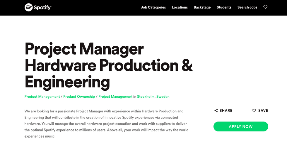 One job listed on Spotify's website is looking for a project manager to take control of the company's hardware production and engineering division. The advert describes someone who will "contribute in the creation of innovative Spotify experiences via connected hardware" and says the successful candidate will work with "a team of world-class Spotify engineers and designers, contractors, manufacturing suppliers etc."