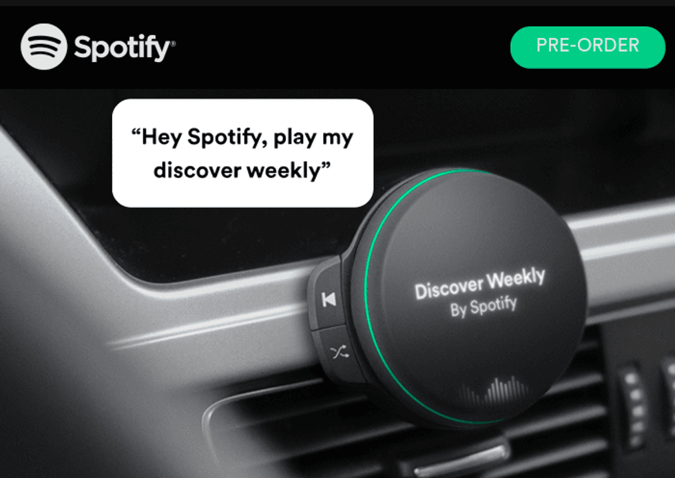 In the same month, some Spotify users posted on Reddit to say thy were shown an offer for a device that would bring Spotify music streaming to cars lacking the technology as standard. An image, above, showed a circular device fitted to a car's dashboard air vent with a simple display on the front and buttons for music playback.