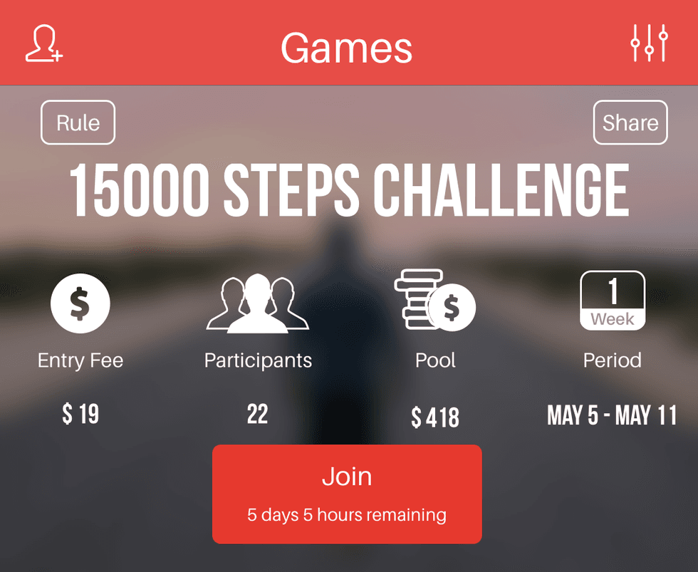 One game may have a $29 entry fee challenging players to walk 15,000 steps over a one week period. Fail, and you forfeit that $29. Complete the goal, and you get your $29 back, plus a cut from those who didn't, which varies, says Woongshik, but could be another $5.