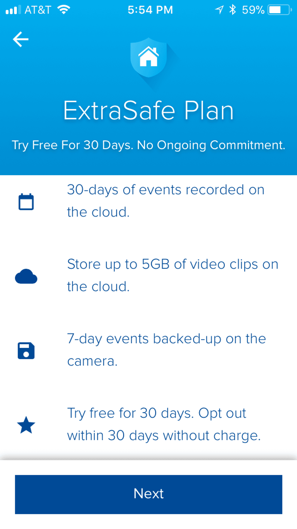 You get two days of free cloud storage, but can expand to two different 30-day plans if needed — both include a free 30-day trial period, plus premium support. The ExtraSafe Pay-As-You-Go Plan costs $4.99 per camera per month and can be cancel at any time. This is ideal for when you're on vacation or planning to leave home for a long period. The second 30-day plan is ExtraSafe Annual Plan. This option also comes with a 30-day free trial but offers two months for free. The cost is $49.99 per camera annually, and there's a payment option, if you need one.