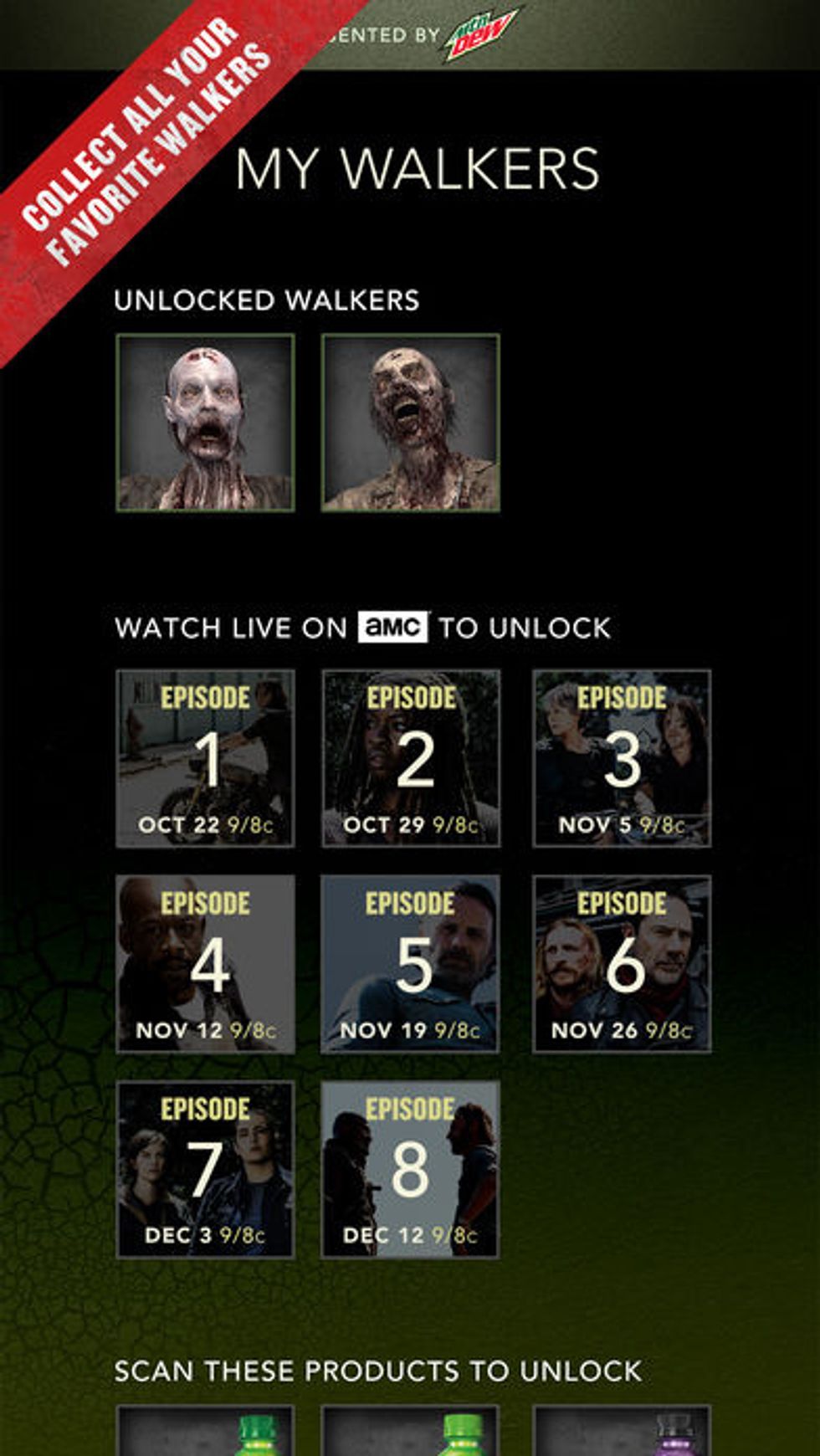 You can also unlock 20 different walkers by scanning Mountain Dew commercials or products, which in itself is an amazing marketing ploy.