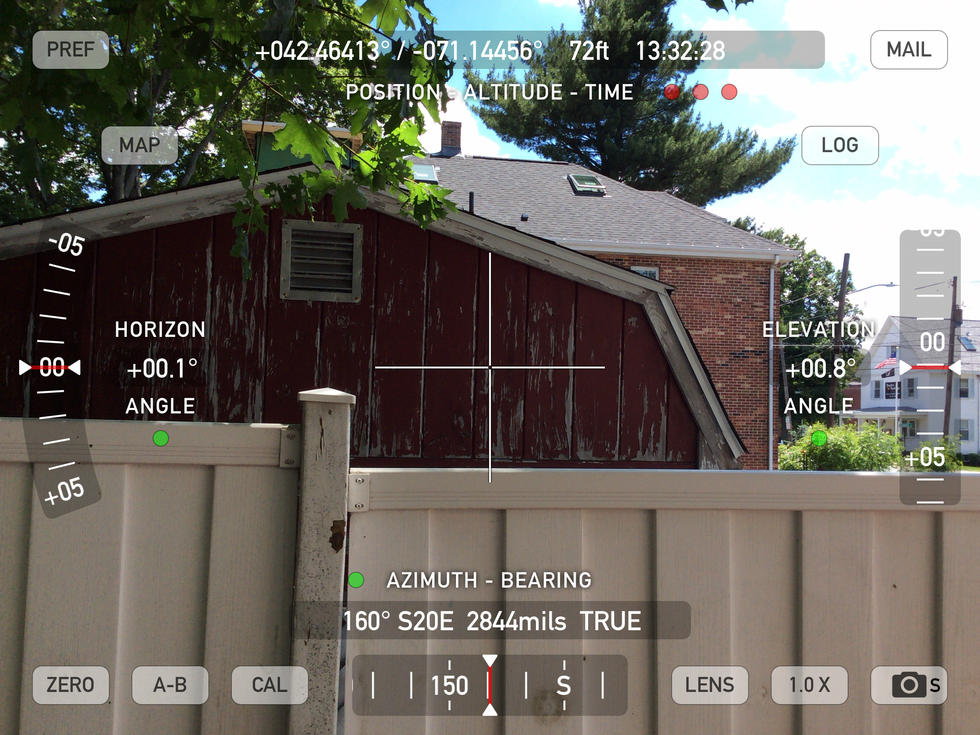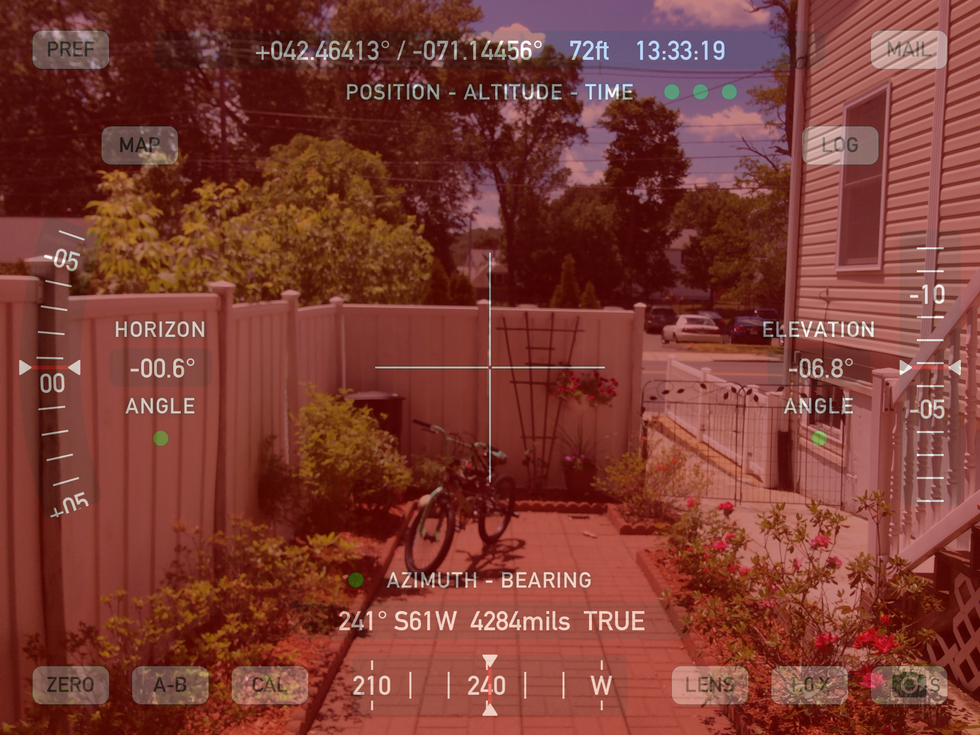 On top, there's a gray bar that tells you your position in coordinates, your altitude in feet and the time in hours, minutes and seconds. On the left, the app tells you your angle away from the horizon and on the right, your elevation. The bottom gray bar tells you the azimuth and bearing.