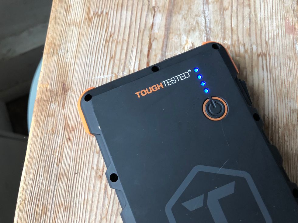 This is a hardy battery. It's waterproof — up to 1 meter for 30 minutes — and pretty hard to break. I have to admit I didn't drop it from a multi-story building, or run a car over the battery. But dropping it several times on a concrete floor, the battery stood up well: there were no visible cracks, the lights still turned on, and it still powered up my devices. Dropping this on a hike, on rocks — you're likely going to be fine.