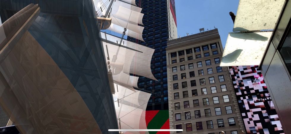 The piece is interesting to try, but still shows the limitations of augmented reality. Sometimes the app fails and requires a restart. It's also hard to grab the entirety of the art piece as you're trying not to bump into people snapping selfies on the street, and actors dressed as Elmo harassing you into paying them for a picture.