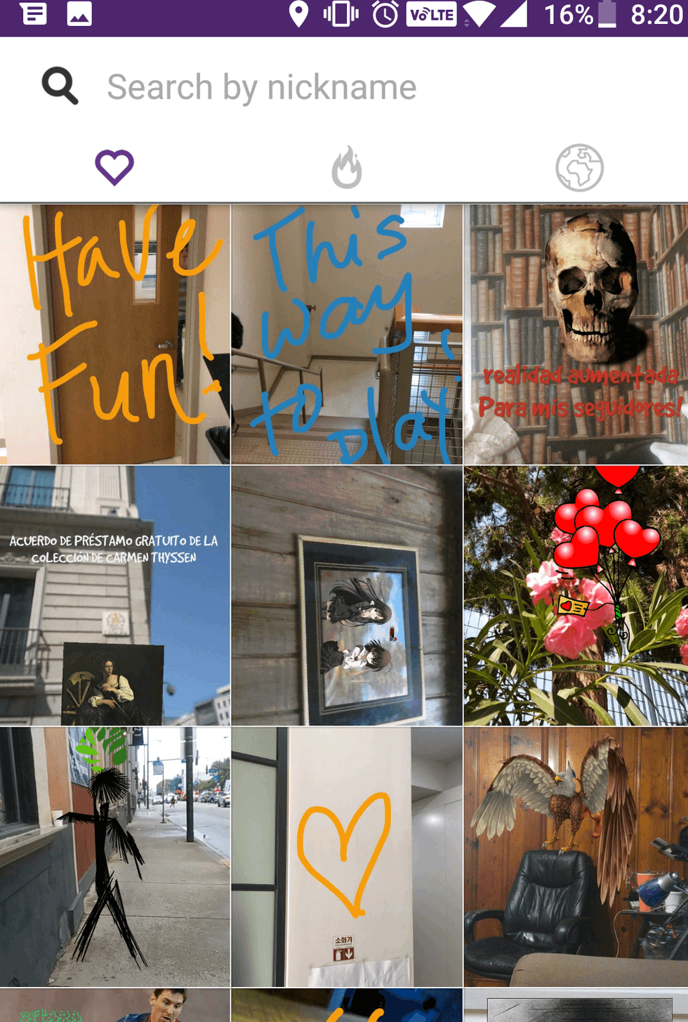 You can also view other user's messages in the public Walls tab. Find users on the Homepage and the Discover page, too. When you tap on the little eye button, the app allows you to search for walls around you with your camera, and even view AR images left in places far away.