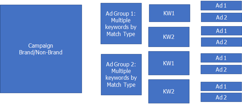 The biggest mistake most B2B marketers make starts at the top of their funnel, specifically the way they set up their keyword campaigns. The traditional setup, detailed below, assigns multiple messages to multiple keywords or "ad groups."