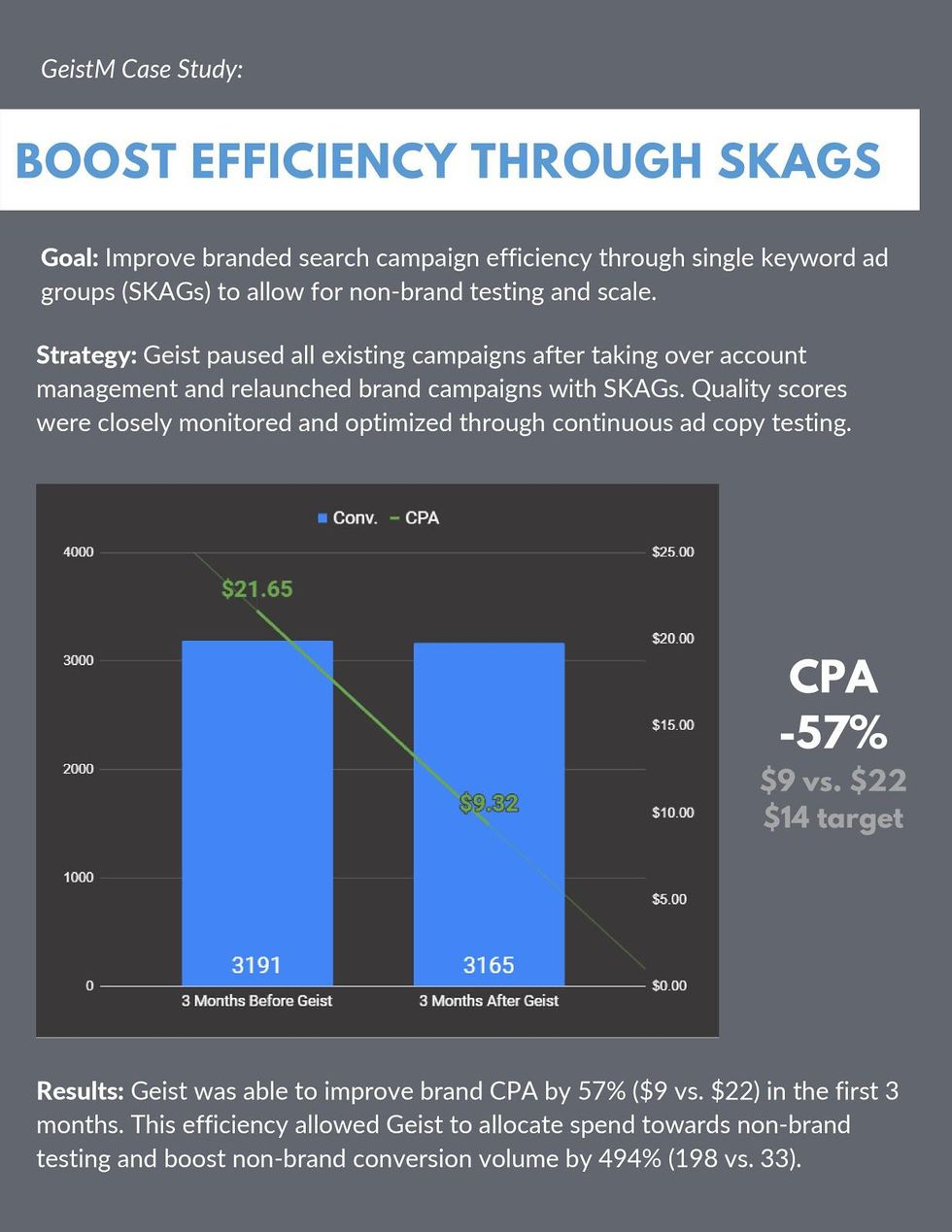 This approach assigns a single keyword to a single ad group. It is significantly more time consuming and difficult to set up on the front end, but it inevitably results in better performance over time. Using the SKAGs approach, GeistM was able to lower one client's cost per acquisition by more than 57% over a 3 month period, while maintaining lead volume.