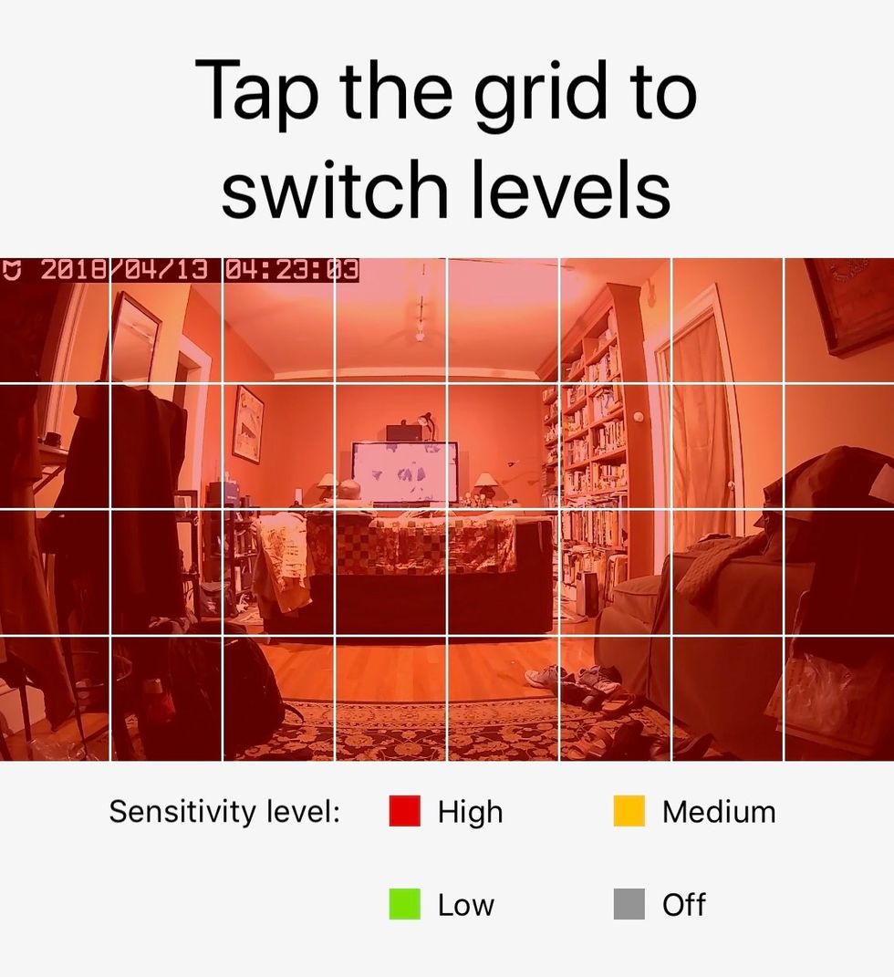 Some Wi-Fi camera apps allow you to more precisely define motion detection areas in what the camera "sees." Xiaomi expands this capability. You get a grid of 32 rectangles overlaying the Mi camera's view, and each rectangle can be tapped to change its motion detection sensitivity to one of four levels: high (red), medium (yellow), low (green) and off (gray). I'm not sure whether lowering the sensitivity of some grid areas increases the sensitivity in others, but lowering the sensitivity of certain areas could reduce the number of false alerts you get such as from pet movements or rustling window shades.