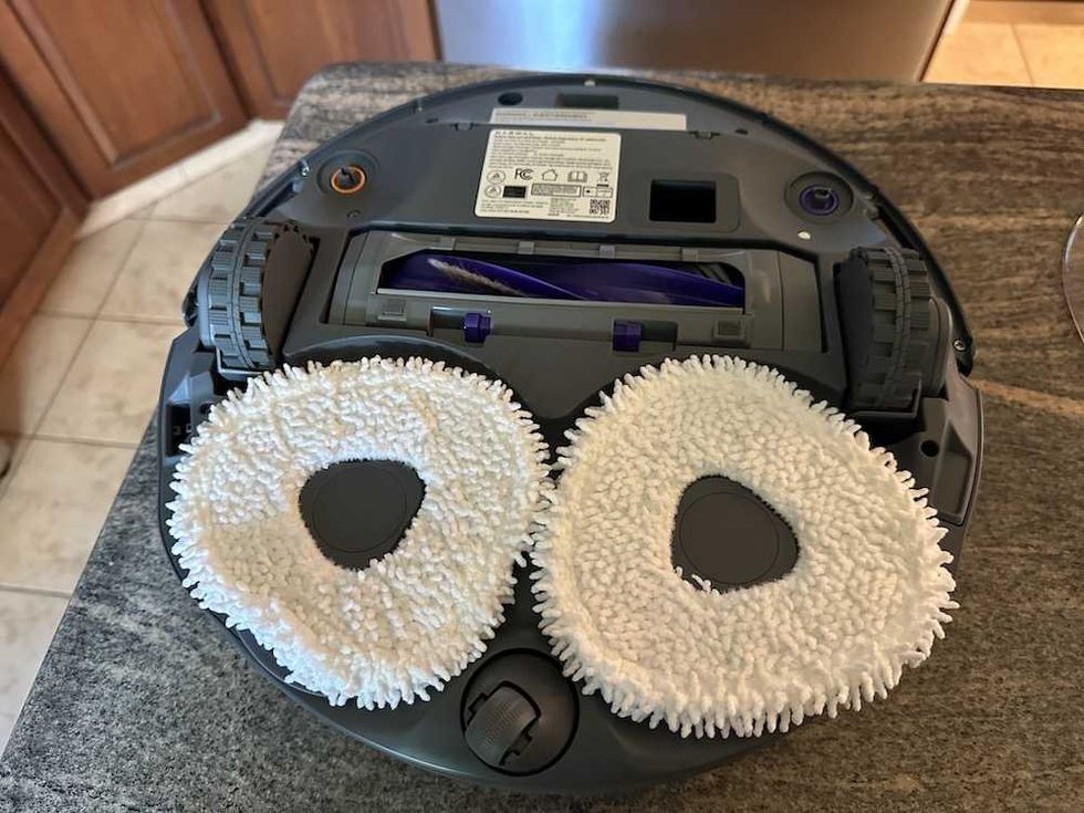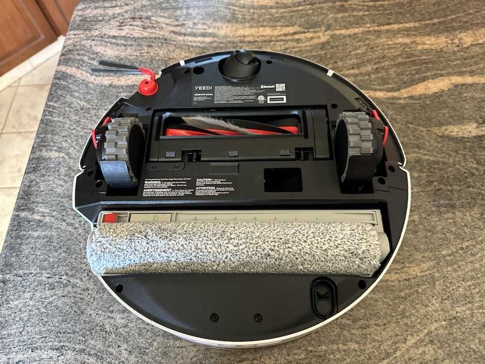 Underneath look at the Yeedi M16 Infinity robot vacuum with Ozmo roller. www.gearbrain.com